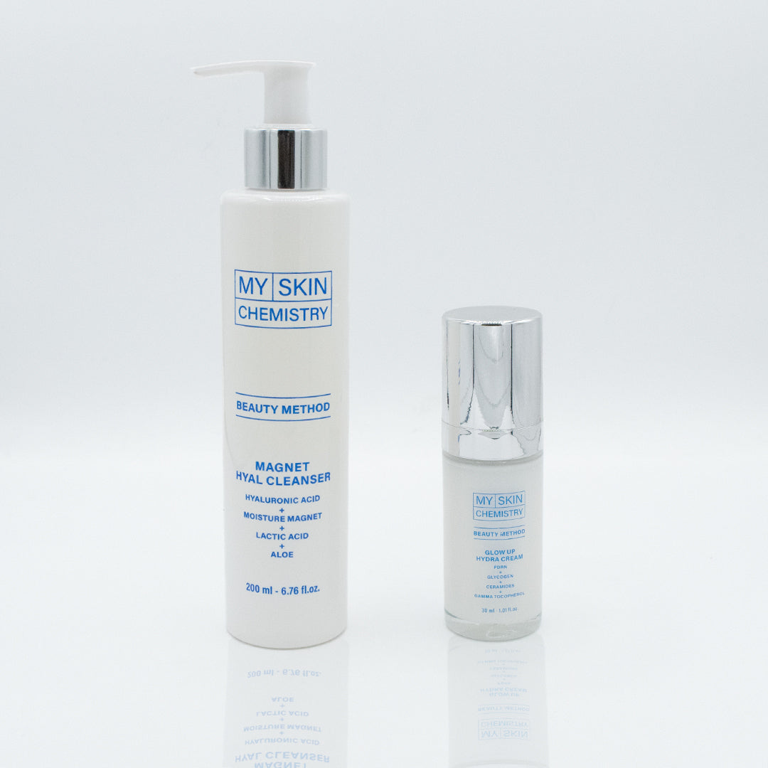 Pareja Perfecta My Skin Chemistry: para pieles con mayor necesidad de hidratación. Magnet Hyal Cleanser es un gel limpiador con Ácido Hialurónico de textura ligera que fija la hidratación y remueve células muertas y residuos de maquillaje. El Glow Up Hydra Cream es una crema hidratante muy completa, con PDRN, Ácido Hialurónico, Glucógeno, Ceramidas y Gamma Tocoferol, que ayuda no solo a humectar sino a tonificar la piel. Sin duda, la pareja perfecta para personas que buscan reducir arrugas y mejorar la textura de la piel en su rutina de limpieza e hidratación diaria.